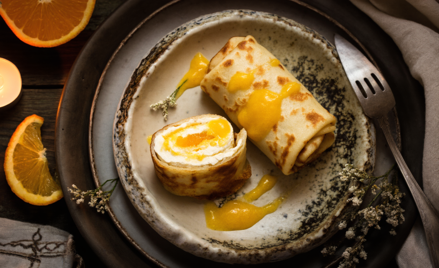 Vegane Crêpes mit Tofu-Quark-Füllung und Orangensauce
