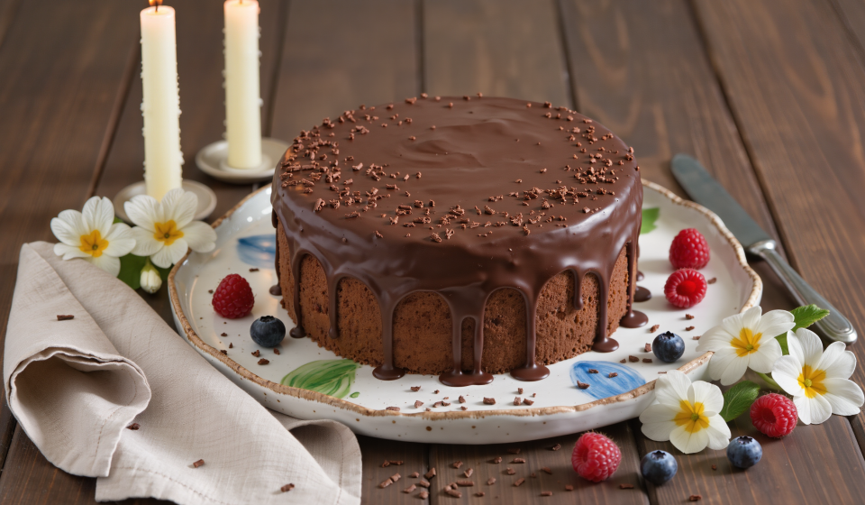 Ganache auf dem Kuchen verteilen und nach Wunsch dekorieren.