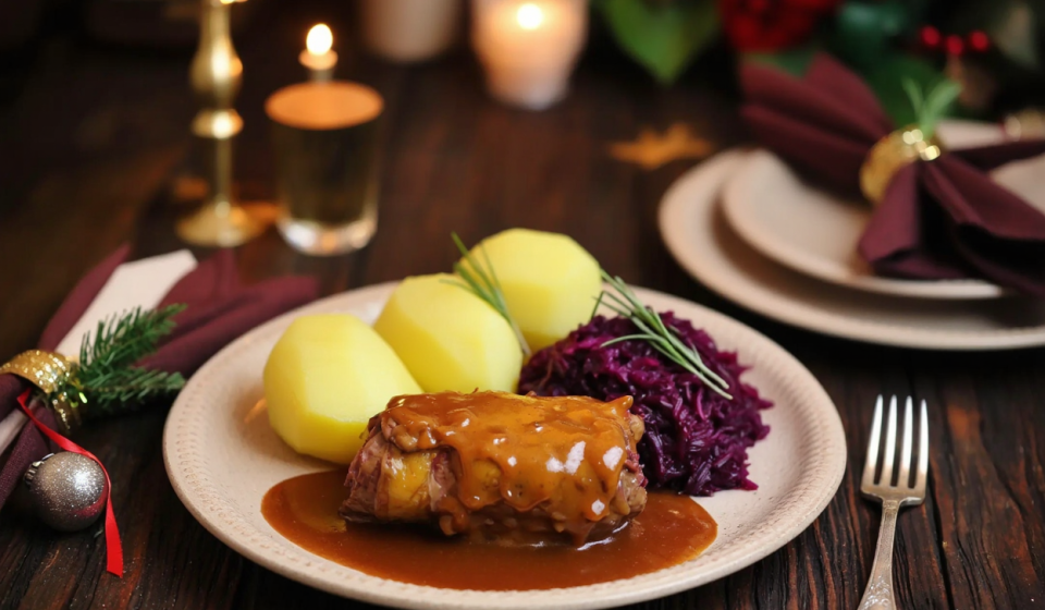 Gemüsebrühe, Rotwein, Sojasauce und Rotweinessig einrühren. Die Sauce aufkochen lassen und einige Minuten köcheln, damit sich die Aromen entfalten.