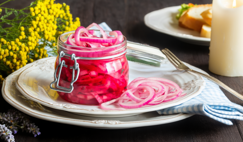 Die eingelegten Zwiebeln sind im Kühlschrank etwa 2–3 Wochen haltbar und passen perfekt zu Salaten, Wraps, Sandwiches, Bowls oder auf Burgern.