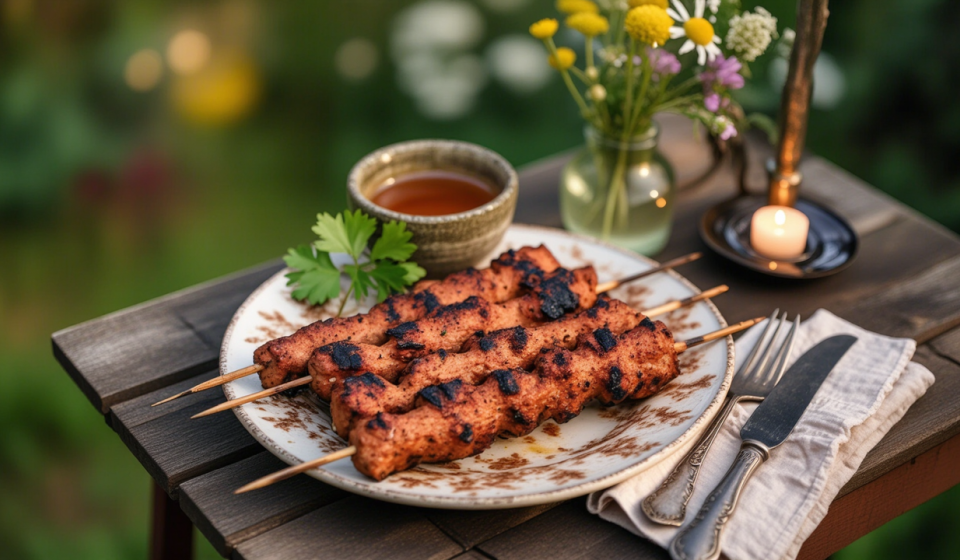 Hausgemachte Seitan-Spieße mit rauchiger Marinade.