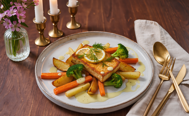 Tofu-Filet à la Bordelaise mit Zitronen-Senf-Sauce (vegan)