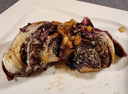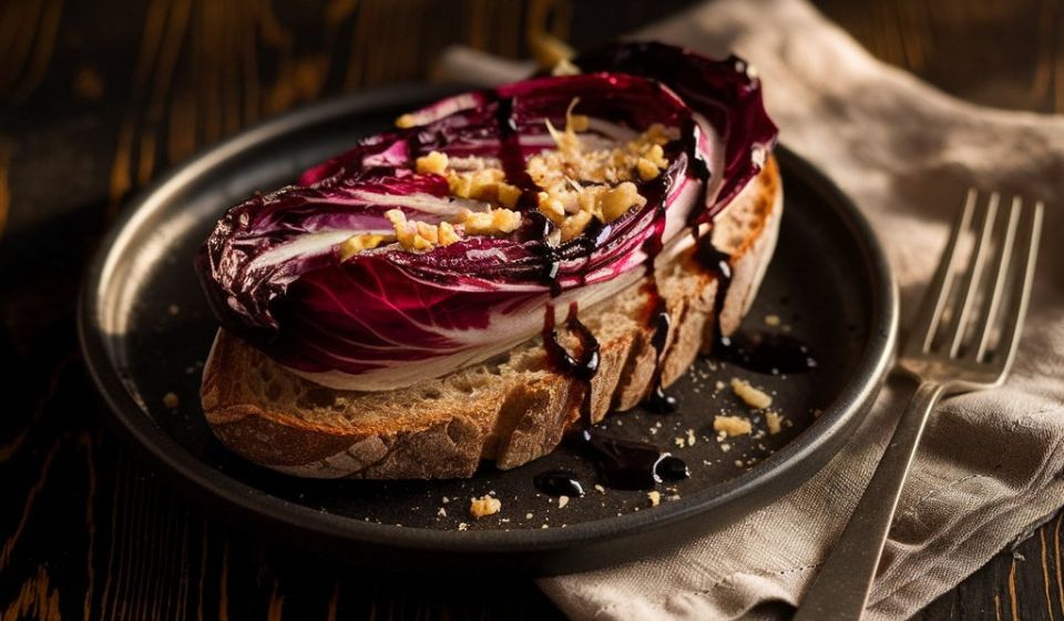 Brotscheiben (nach Wunsch auch geröstet) auf die Teller legen. Den Radicchio darauf anrichten, mit veganem Parmesan bestreuen und nach Belieben mit Salz und Pfeffer würzen.