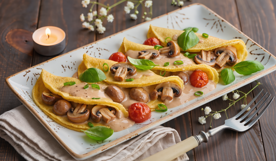 Maispfannkuchen mit dem cremigen Gemüse-Pilzragout füllen, zusammenklappen und frisch servieren.