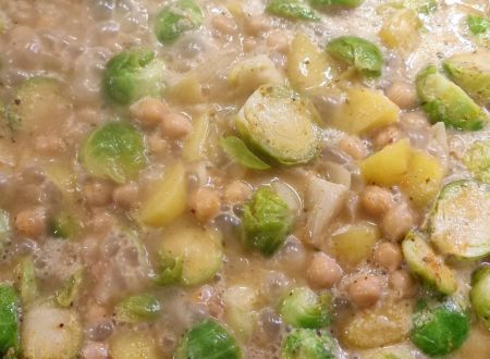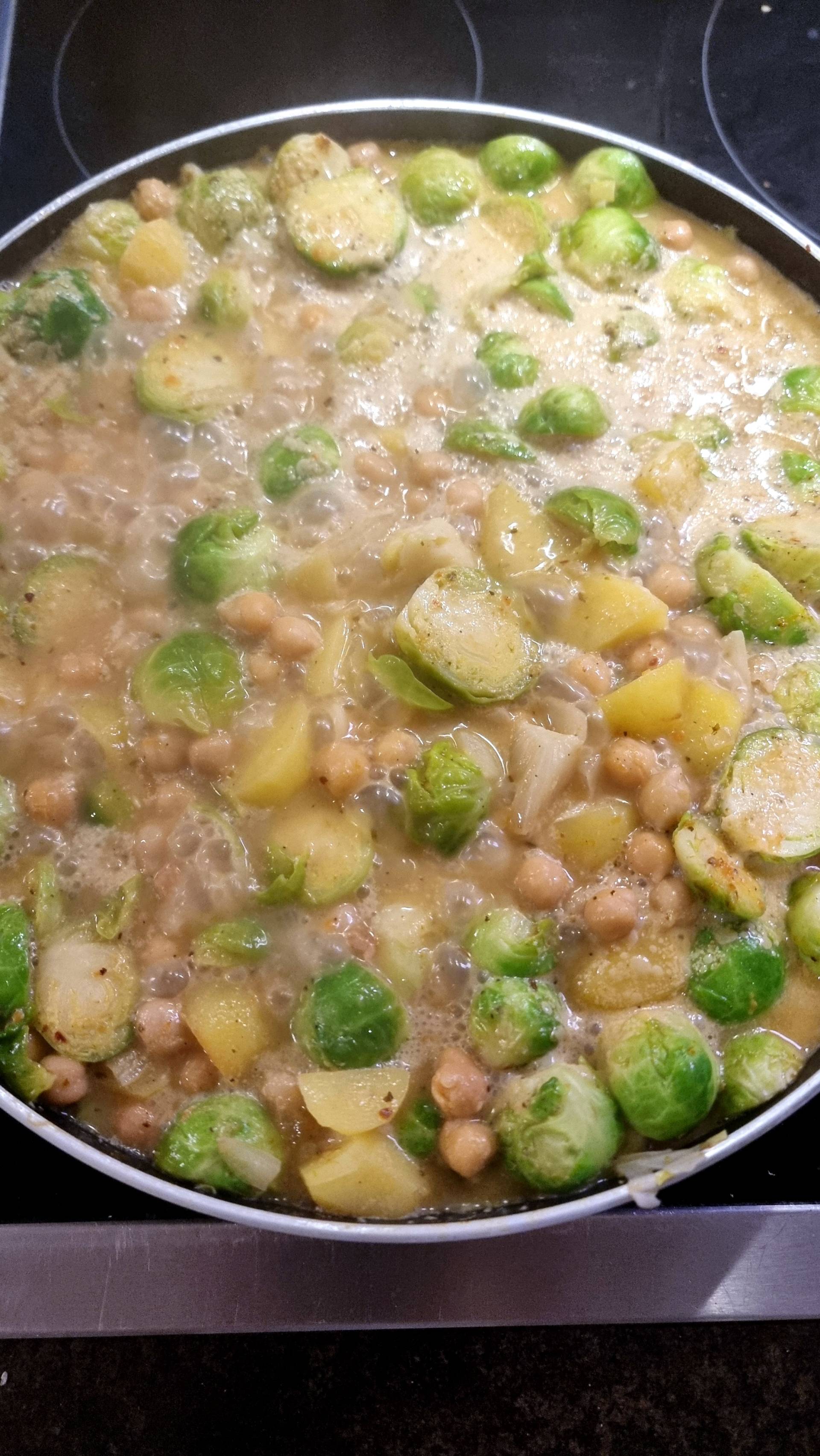 - Rosenkohl und Kartoffeln dazugeben und weitere 2-3 Minuten mitdünsten.