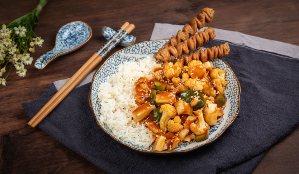 Vegane Kung Pao Chinapfanne mit knusprigen Blumenkohlnuggets