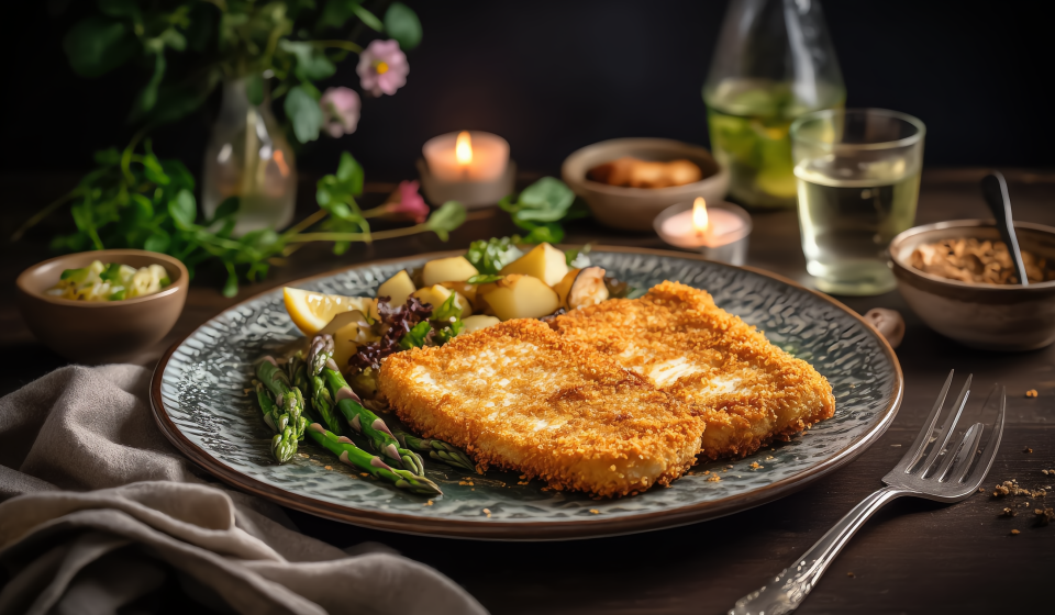 Etwas Öl in einer Pfanne erhitzen. Die panierten Tofuscheiben bei mittlerer Hitze von beiden Seiten ca. 3–4 Minuten goldbraun und knusprig braten.