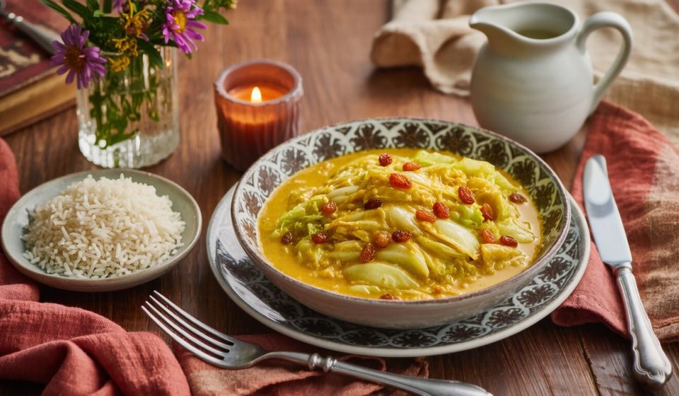 Den Wirsing mit Kokosmilch heiß mit frisch gekochtem Reis servieren. Optional mit frischem Koriander oder gerösteten Cashews toppen.