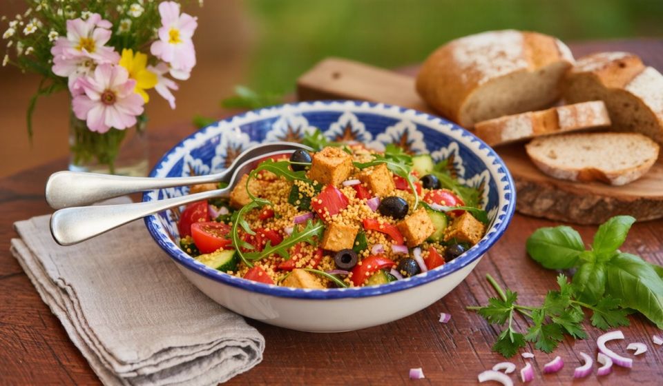 Couscous oder Quinoa als Basis in Schüsseln geben. Das geschnittene Gemüse, Rucola oder Spinat und den gebratenen Tofu darauf anrichten. Mit dem Dressing beträufeln und mit frischer Petersilie bestreuen.