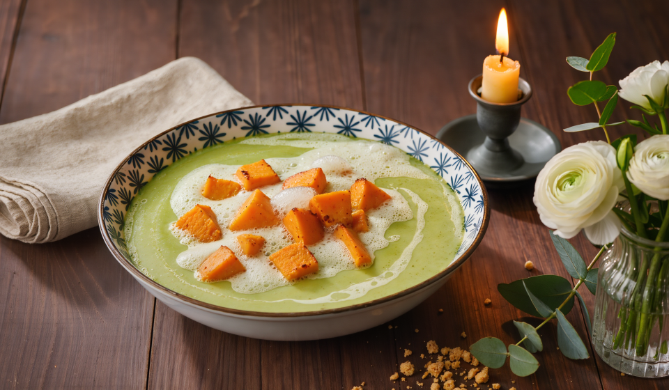 Die Suppe in Schalen füllen, mit Milchschaum toppen und die gebackenen Süßkartoffelwürfel entweder direkt in die Suppe geben oder dekorativ dazu servieren.