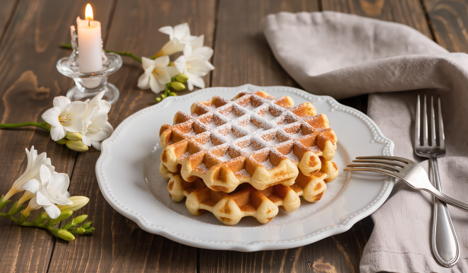 Carefully remove the finished waffles from the iron and dust with powdered sugar. Serve immediately.