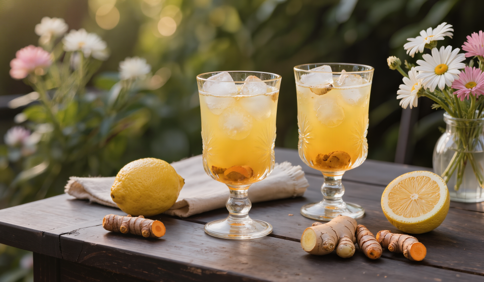 Combine lemon juice, turmeric and ginger in a jug or large glass. Stir well.