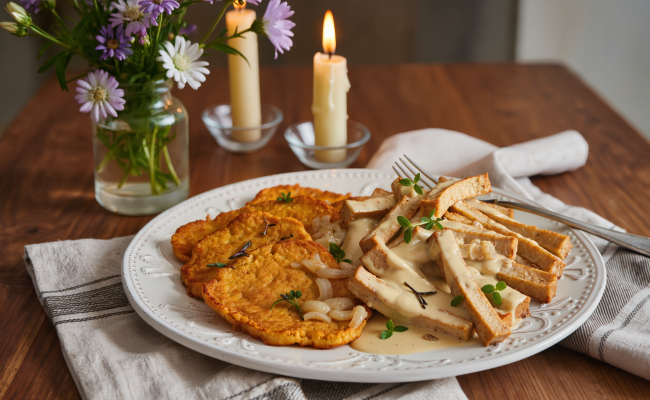 Vegan Creamy Strips with Crispy Sweet Potato Rösti