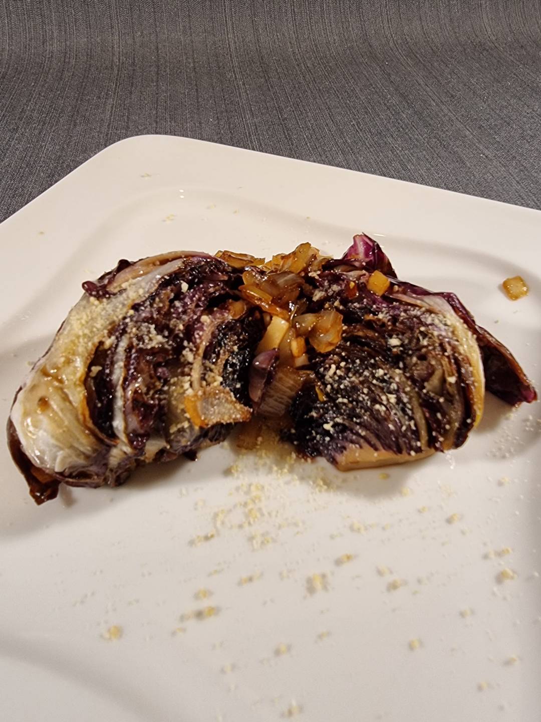 Place toasted wholemeal bread slices on the plates. Arrange the radicchio on top, sprinkle with vegan parmesan and season with salt and pepper to taste.