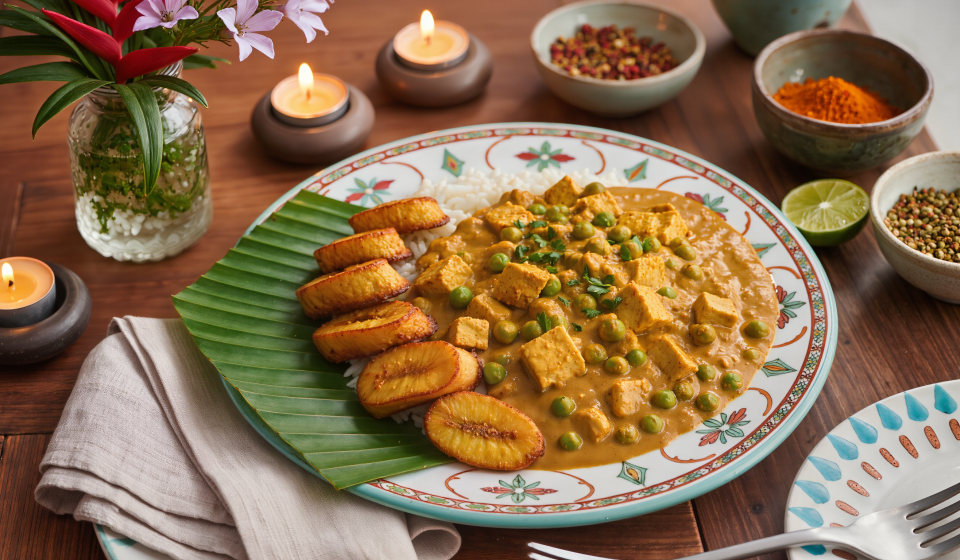 Plate rice with the tofu curry and top with spiced bananas. Optional: serve on a banana leaf for authentic Caribbean flair.