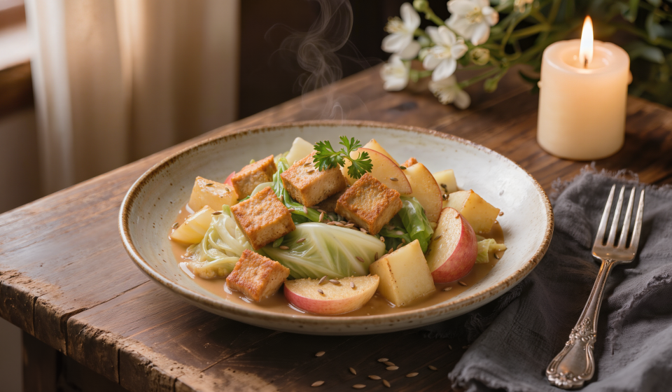Dice the potatoes and parboil them in salted water for about 12–15 minutes (or use leftovers from the day before). Remove the core from the cabbage and cut into fine strips. Finely dice the smoked tofu, core the apples and cut into wedges, and dice the onion.