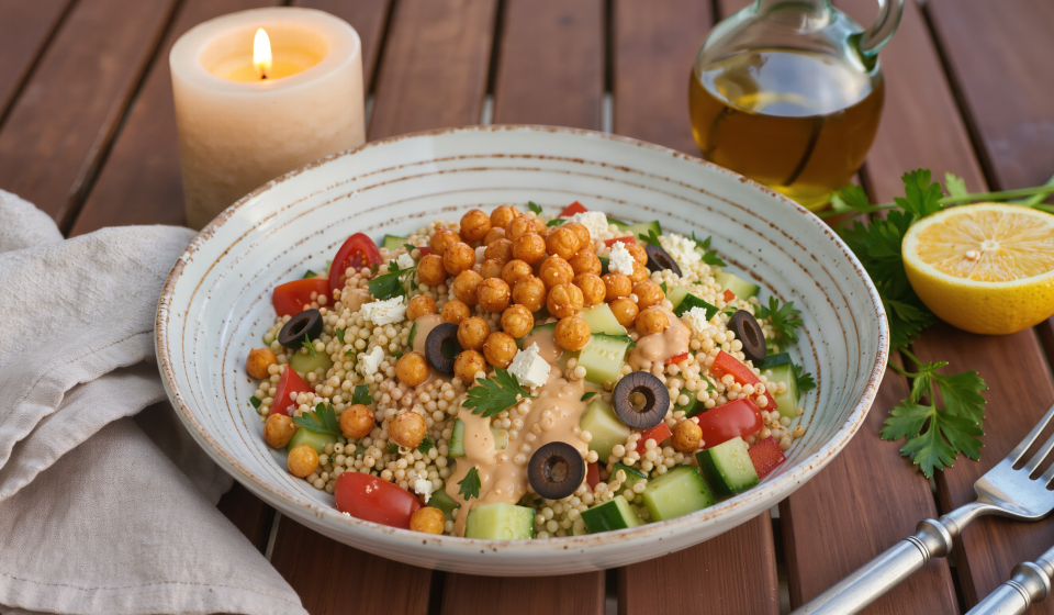 Lemon Sesame Couscous Bowl with Crispy Chickpeas