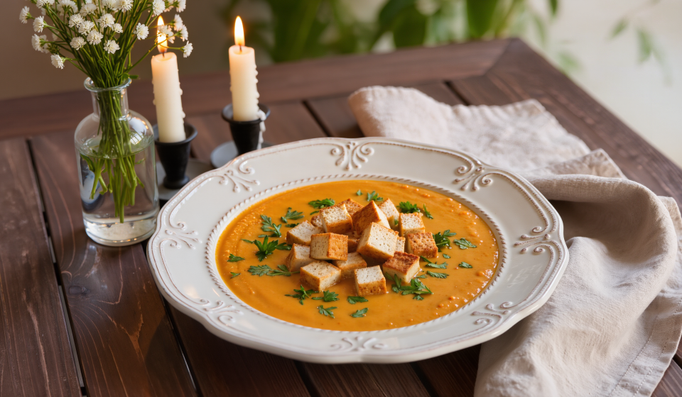 Place tofu in bowls, pour hot carrot cream soup over it, garnish with chervil or parsley and serve with vegan croutons.