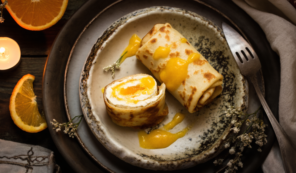 Crêpes with Tofu Quark Filling and Orange Sauce